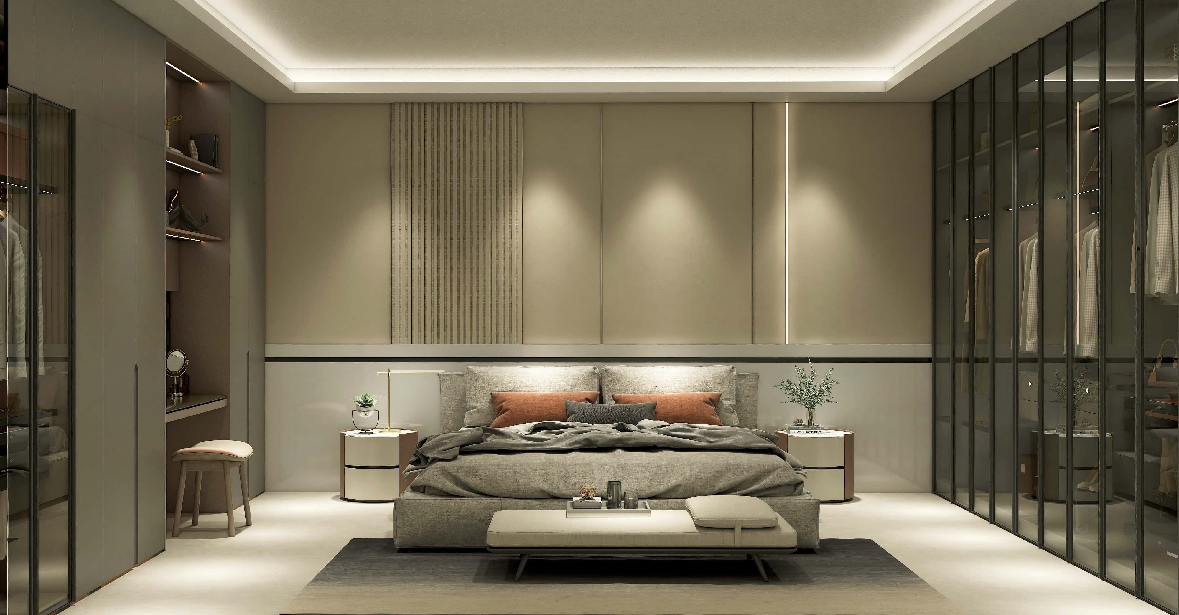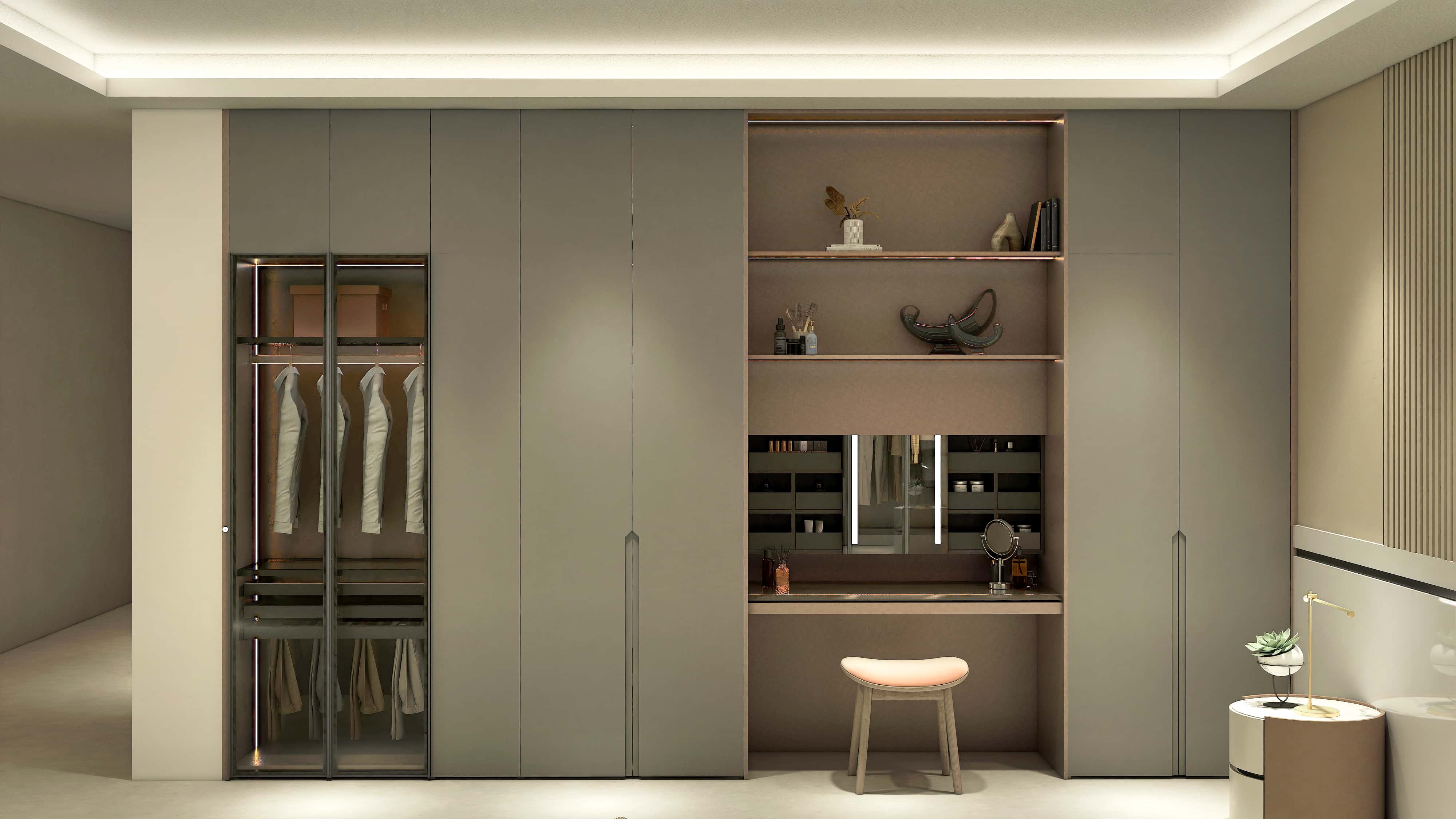 ⼀个有品位的⾐帽空间,让⾼品质的⽣活⽅式在⾝边蔓延。 玻⻔与实⻔结合, 让空间呈现层次感的同时凸显精致⾼级范。
