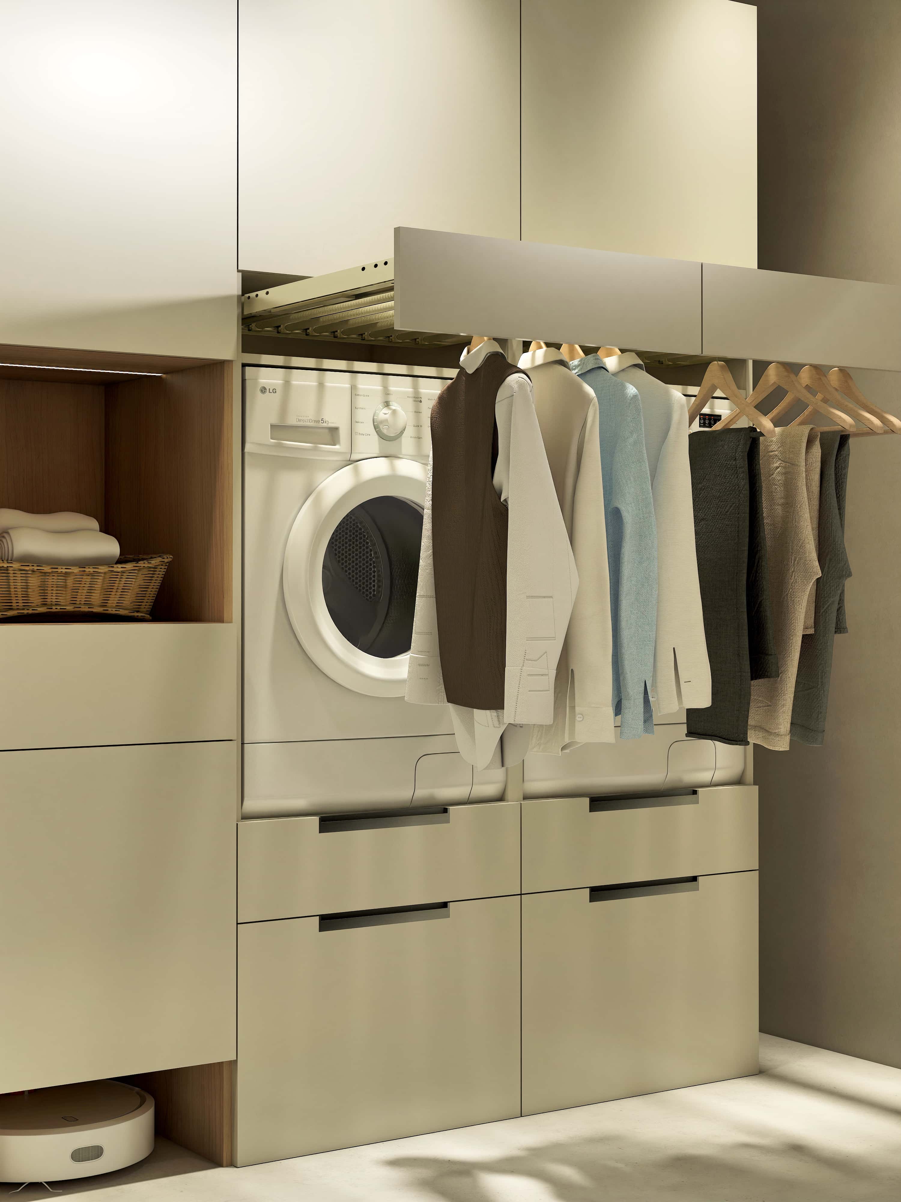 清爽利落的⾊彩搭配,暗藏⽞机的抽⻔设计。⼀点巧思,多些收纳,让您轻松拥有⼀个洁净阳台空间。 抽拉式操作桌台,轻松放置拿取⾐服,功能兼具整洁。