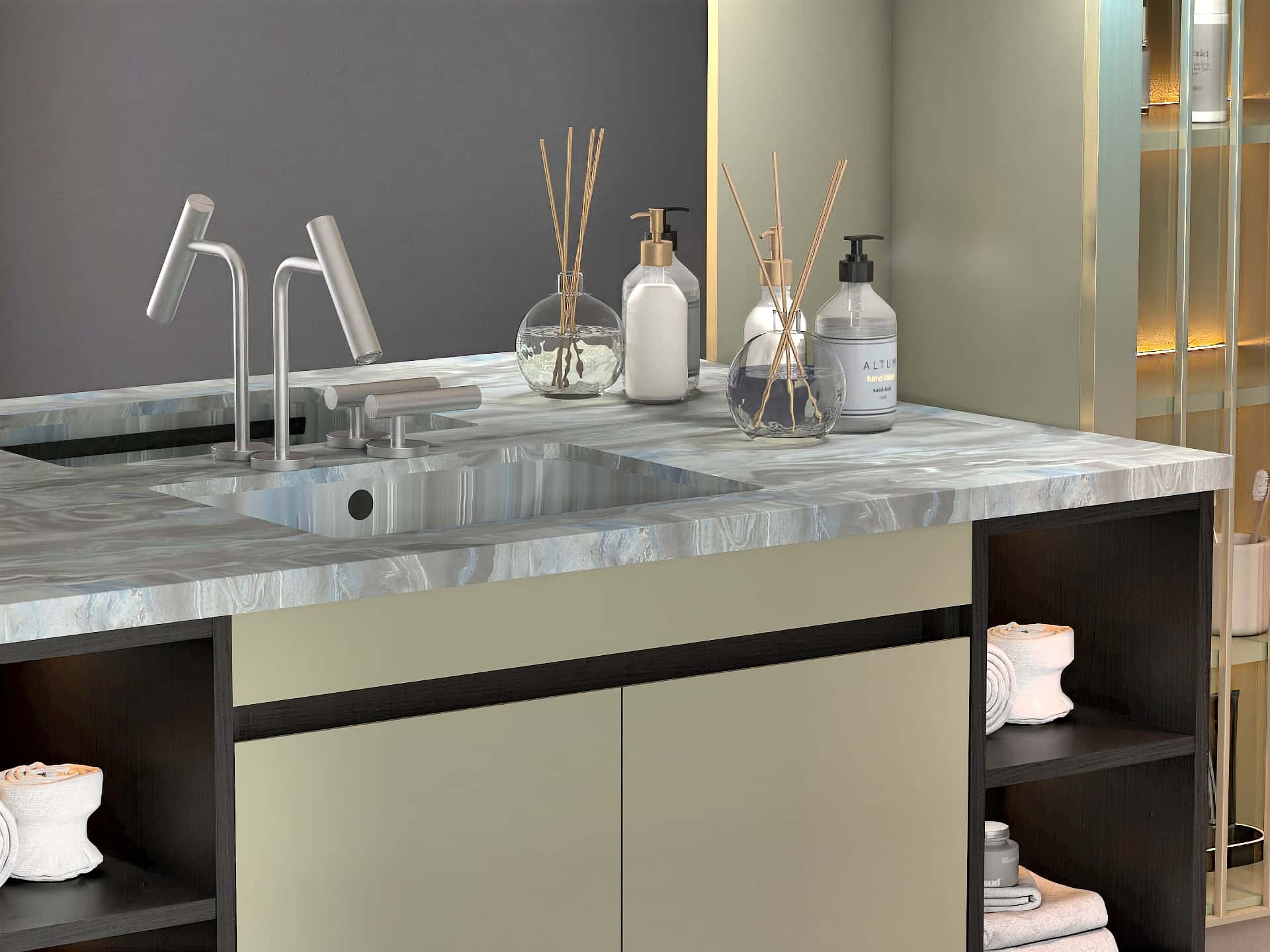 ⼀个以⼤⾃然、亚⻢逊⾬林和⼤湿地为灵感的浴室柜。 设计灵感来源于亚⻢逊⾬林的神秘和⽣机勃勃的氛围, 让你在每天的洗漱和休息时间中感受⼤⾃然的美妙。
